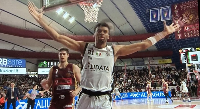 N.B. bis: nella foto Derrick Alston vola dopo aver schiacciato la palla della vittoria della Virtus sulla Reyer ieri al Taliercio (foto MorstuavitaPea).