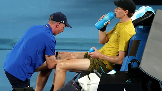 N.B.: oggi in esclusiva per i miei aficionados del sito l’aforisma preferito dall’autore di “A sogni in faccia”, il grande Francesco Sarti. Che ha scelto questo tra più di trecento: “In campagna c’è il silenzio, in città l’omertà”. Verissimo. Mentre nella nuova foto non ci sono più i dieci, dodici tifosi di Mestre sbattuti mercoledì scorso sulla scalinata del palasport di Roseto, e perché non nel sottoscala con Fantozzi?, ma il nostro Jannik Sinner coi crampi. Poveraccio. Mentre Carlos Alcaraz lo prendeva in giro mimando – ha scritto Repubblica – l’incedere zoppicante dell’altoatesino.